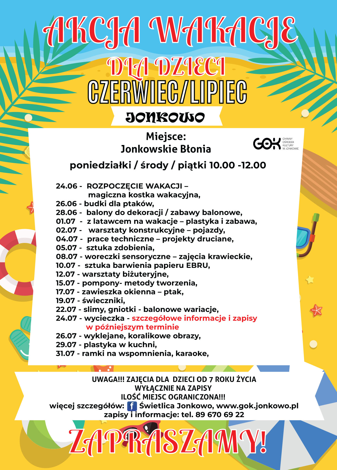 ZAJĘCIA WAKACYJNE DLA DZIECI. AKCJA WAKACJE- SIERPIEŃ 2024 Jonkowskie Błonia, godz. 10:00 - 12:00. Zapisy pod nr 516185271.